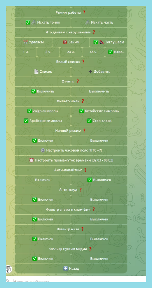 + настройте в какое время в Вашем чате возможно отправлять сообщения